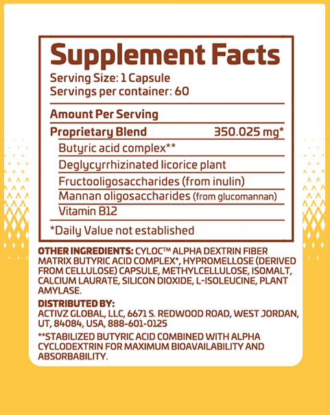 ACTIVZ LINQ solves that. Its proprietary delivery system supplies butyric acid directly—while also helping your body produce more on its own, right where it’s needed: in the large intestine.